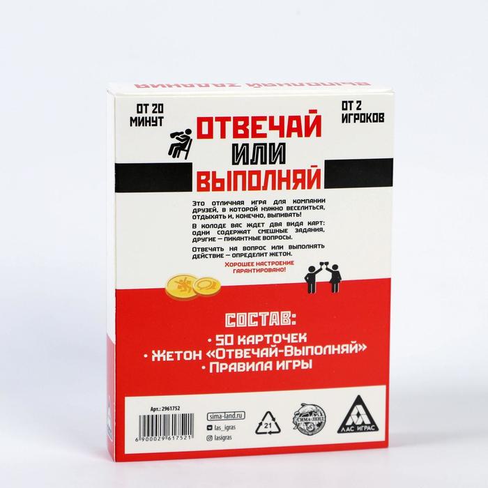 В колоде есть 2 вида карт: одни содержат смешные задания, другие — пикантные вопросы. Отвечать честно или импровизировать, выбирать вам. Главное, чтобы было очень весело!