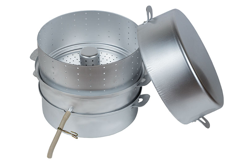 Посуда изготовлена из алюминия пищевого без покрытия. Соковарка очень легко разбирается, собирается и моется. Её конструкция состоит из нескольких модулей: базовой кастрюли, ёмкости для сбора готового сока, сетки для загрузки свежих плодов и глубокой крышки.